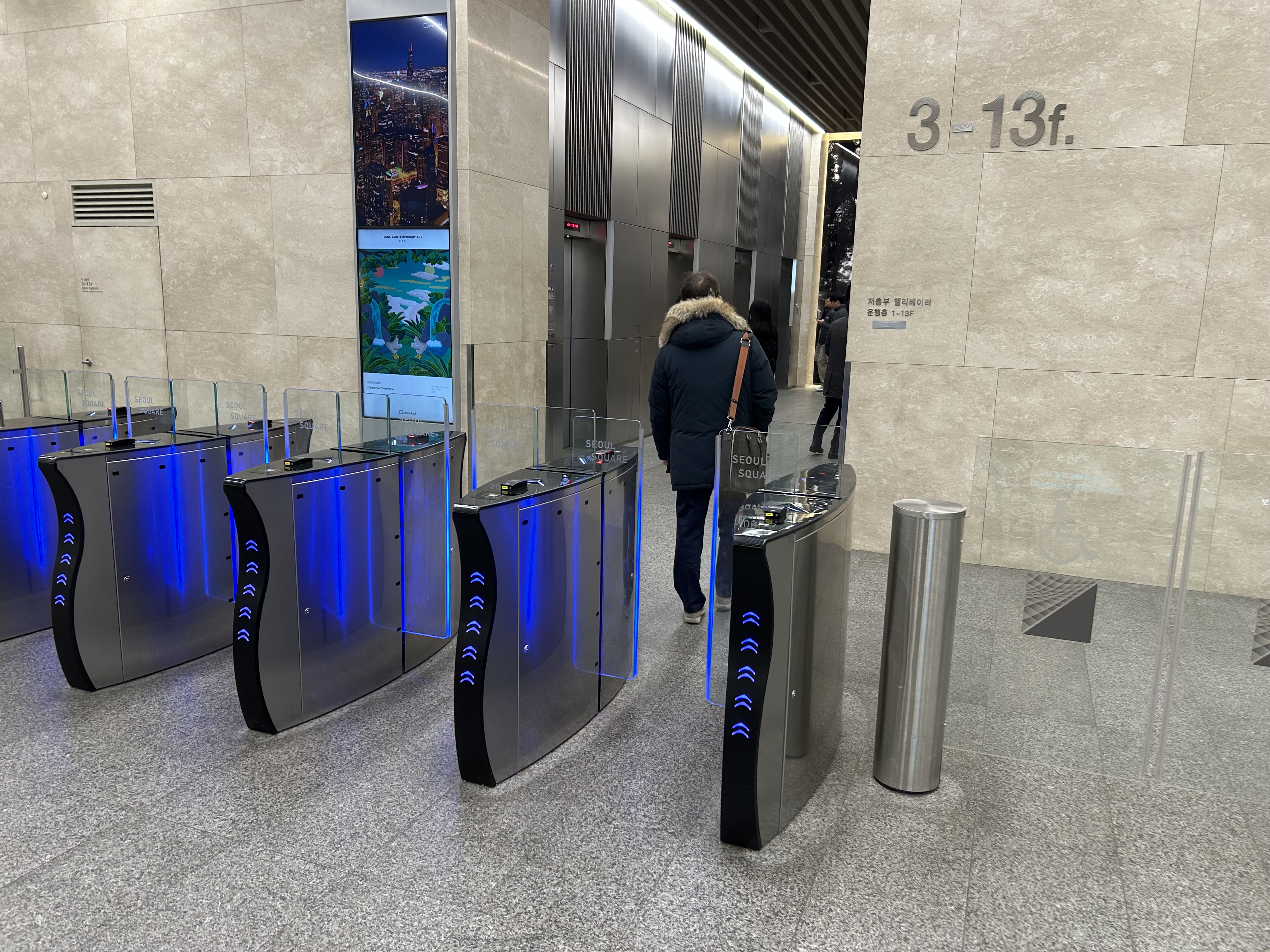 서울역ktx 방향 회전문으로 출입 -> 1층 안내데스크 출입증(건물 앞쪽) 수령 -> 건물 뒤쪽으로 이동 후 중앙 스피드게이트 이용 -> 우측 저층부 엘리베이터 이용 -> 4층 도착.